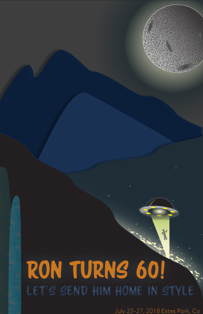 Celebrating a loved ones’ birthday and pending retirement in their favorite place, the family wanted a shareable, tongue-in-cheek poster to commemorate the occasion. Using throw-back typography reminiscent of the 1950s along with a nod to the alien craze in 1958, the shareable image quickly became a favorite and was printed out to poster-size for safe-keeping of this fully Illustrator-used design.