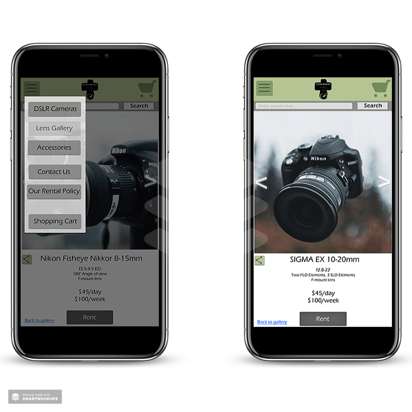 A simple to use, easy to navigate, image-intensive shopping app prototype for a no-nonsense camera rental company. Straight-forward interactivity and inclusive design with large hot spots for easy navigation and strolling through the clear images of the products. Using Illustrator, Photoshop, and InDesign to plan was followed with an interactive prototype in Invision.